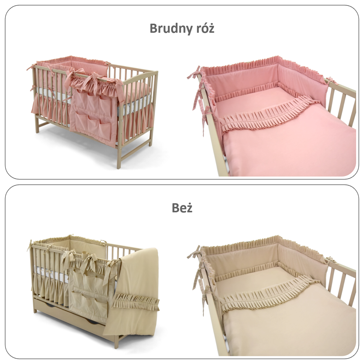 Całość tworzy kompletną, elegancką wyprawkę w stylu Glamour – bezpieczną, funkcjonalną i dopracowaną w każdym detalu. Zestaw łączy estetykę z praktycznymi rozwiązaniami, zapewniając dziecku komfort snu, a rodzicom wygodę codziennego użytkowania.